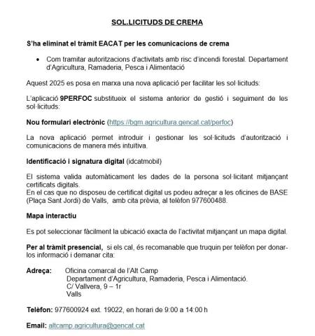 SOL.LICITUDS DE CREMA S’ha eliminat el tràmit EACAT per les comunicacions de crema Com tramitar autoritzacions d’activitats amb risc d’incendi forestal. Departament d’Agricultura, Ramaderia, Pesca i Alimentació Aquest 2025 es posa en marxa una nova aplicació per facilitar les sol·licituds: L’...